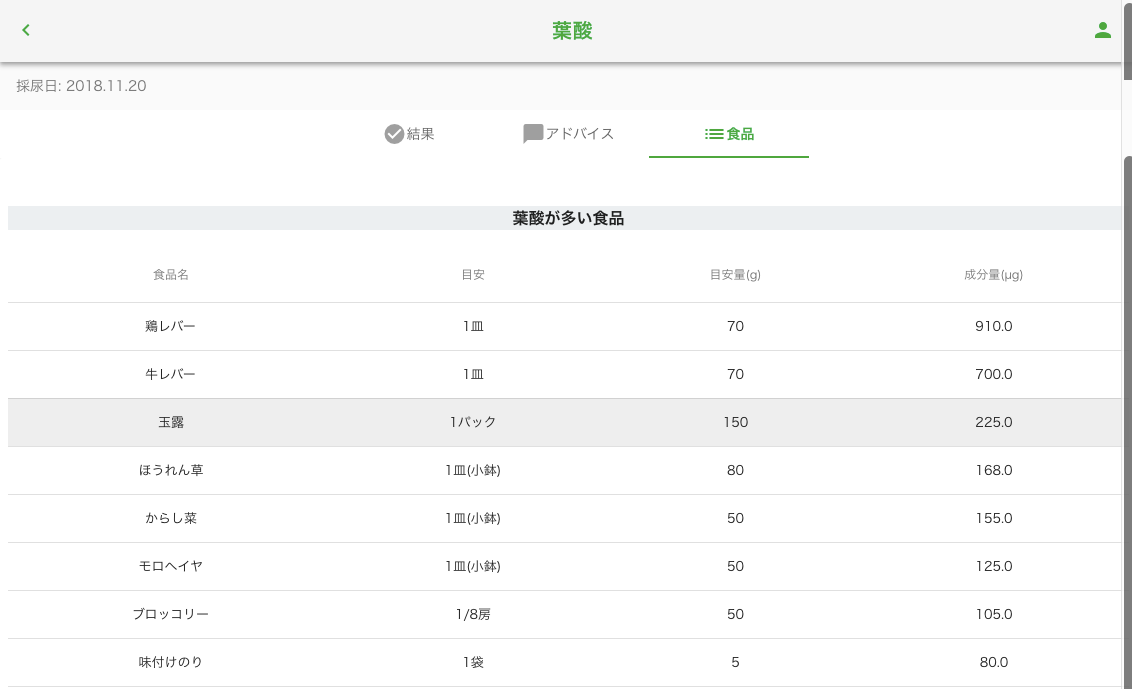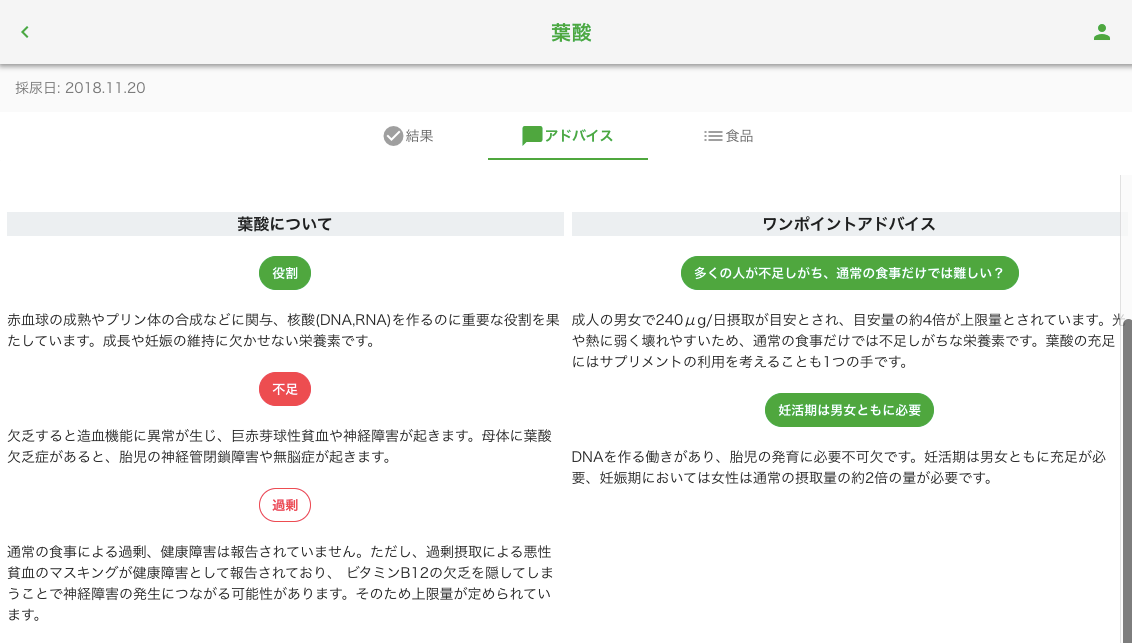 アドバイスの画面では栄養素の役割と、その栄養素が不足・過剰の場合についての説明が書いてありとても参考になりました。ワンポイントアドバイスも「へぇ〜」となる内容が書いてあります。